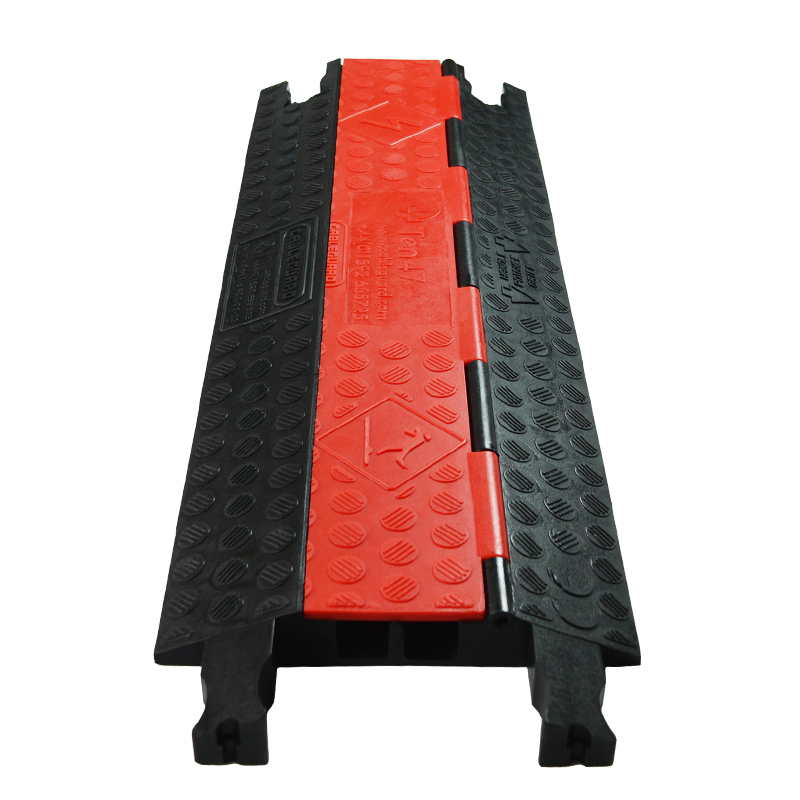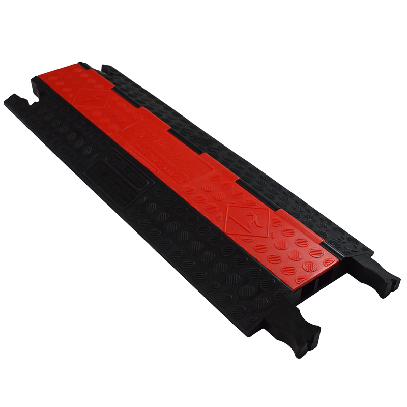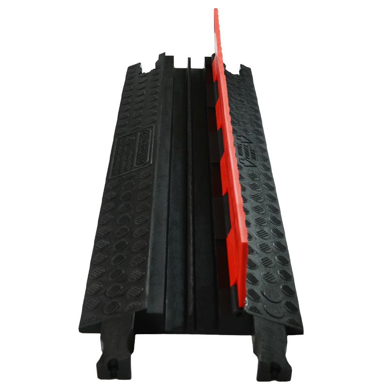 Heavy Duty 2 Channel Cable Ramp with large bolt hole connector, field proven for robustness with the ability to attach to the ground. For use with high volume pedestrian and vehicular traffic.